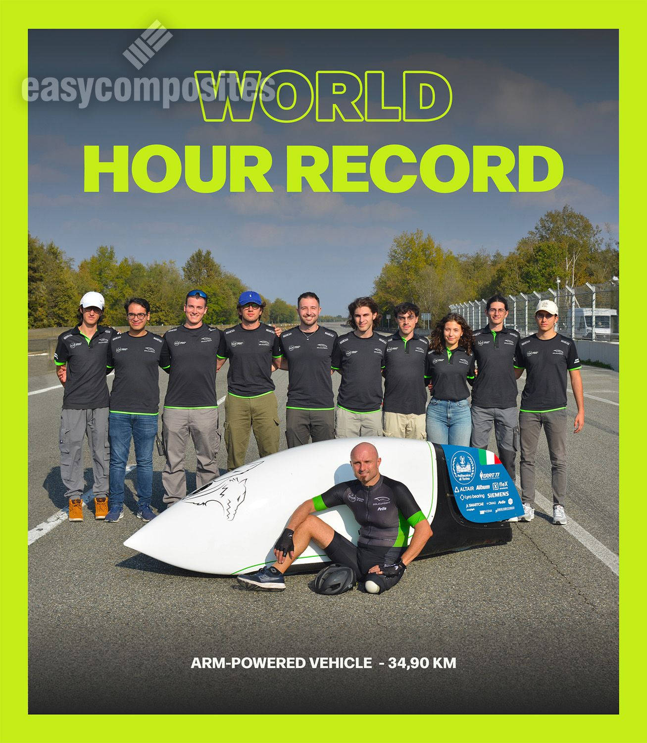 Cerberus is an hand-trike, so a arm-powered vehicle with three wheels, in a "tadpole" configuration, so two wheels at the front and one at the back. It has been designed with the intent to break the world record of 83.02 km/h, Cerberus successfully beat this speed during the 2024 WHPSC, reaching 83.28 km/h and claiming the new world record.